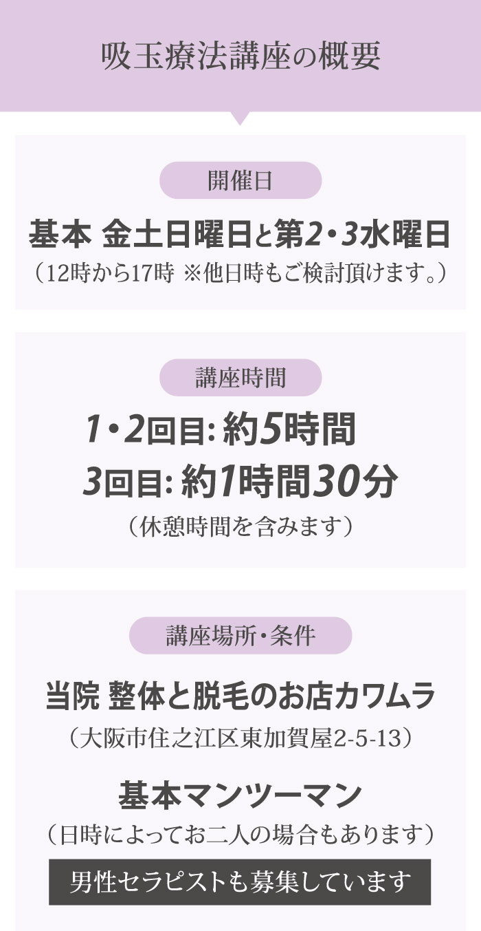 2日間集中!吸玉講座 整体と脱毛のお店 カワムラの公式サイトです。